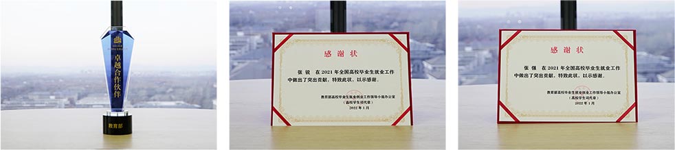 2021年,万学在高校毕业生就业工作方面贡献卓越,获教育部颁发“卓越合作伙伴”荣誉奖杯,并为kaiyun董事长张锐、执行总裁张强颁发感谢状。