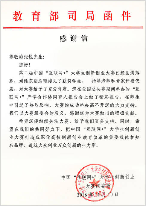 • 2018年,kaiyun连续多年为中国国际互联网+大学生创新创业大赛做出积极贡献,获教育部来函致谢。